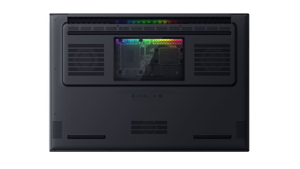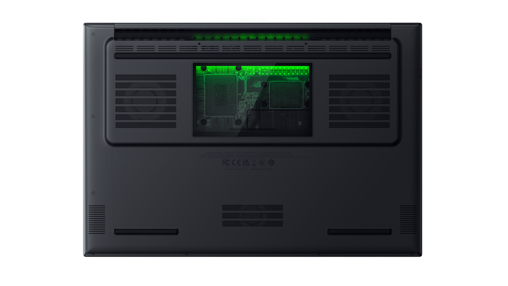 Về thiết kế, Razer đã thực hiện những thay đổi đáng chú ý cả về thiết kế lẫn công năng, thay vì chỉ đơn thuần giữ phong cách tối giản như các thế hệ trước. Trước hết, điểm nổi bật nhất là khu vực cửa sổ trong suốt (transparent window) được đặt ở trung tâm phần nắp lưng. Qua ô kính này, người dùng có thể quan sát trực tiếp một phần linh kiện bên trong như heatpipe, layout bo mạch hoặc vùng tản nhiệt, kèm hiệu ứng ánh sáng tùy chỉnh trên Razer Synapse. Chi tiết này mang đậm phong cách tương lai, “performance-first”, vừa tạo điểm nhấn thẩm mỹ, vừa nhấn mạnh định hướng desktop-replacement của Blade 18. Đây cũng là một thay đổi khá táo bạo so với phong cách kín đáo, tối giản trước đây của dòng Blade.